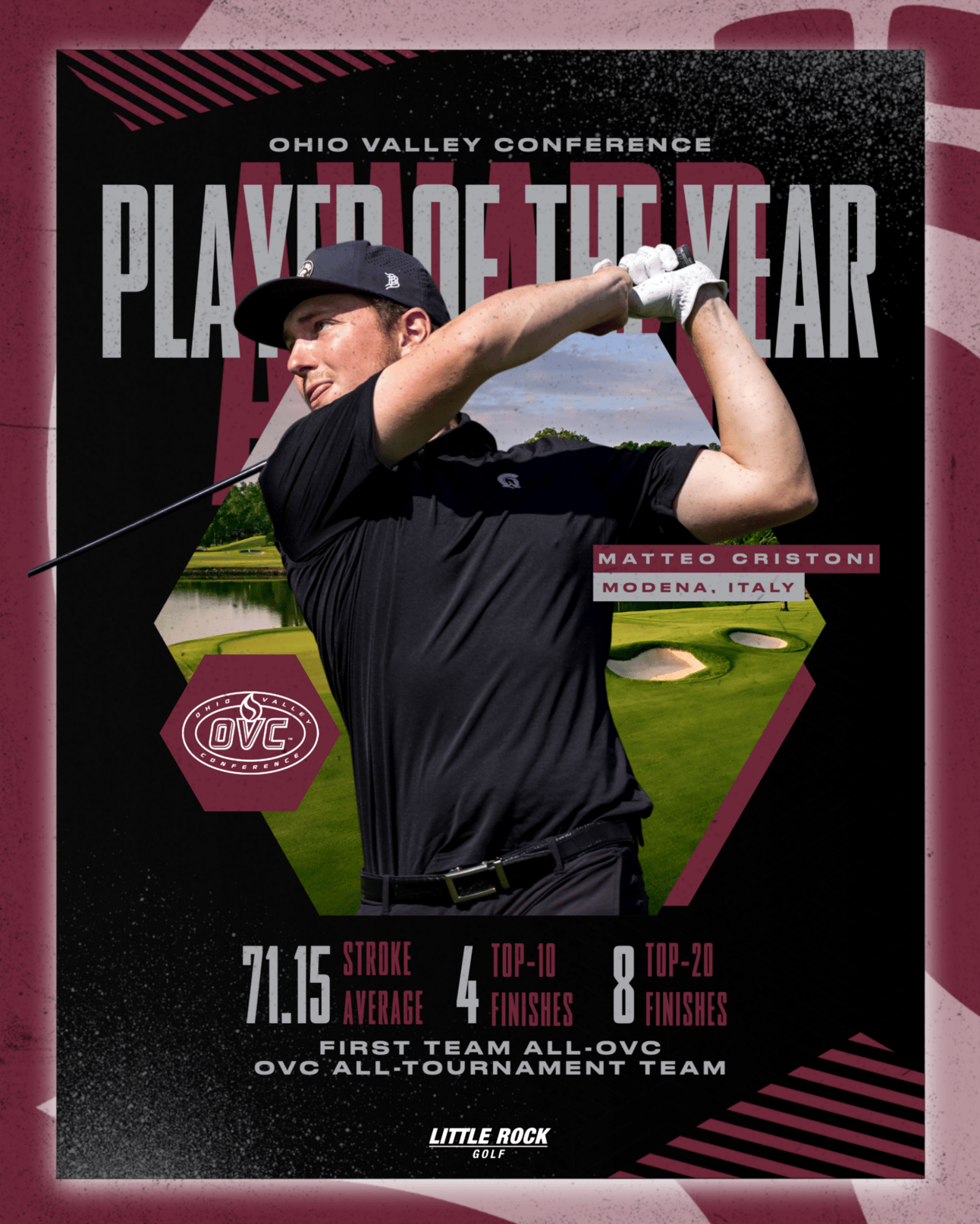 On Tuesday, Rhett South claimed the individual title after firing rounds of 72-65-73 to tie for medalist before winning in a playoff. The victory was Rhett’s first collegiate victory while also marking the third individual medalist in the three years Little Rock has been in the OVC (Anton Albers - 2023 & Archie Smith - 2024). Rhett South and Matteo Cristoni were also named to the OVC All-Tournament team for finishing in the top-5 during the stroke play portion.
