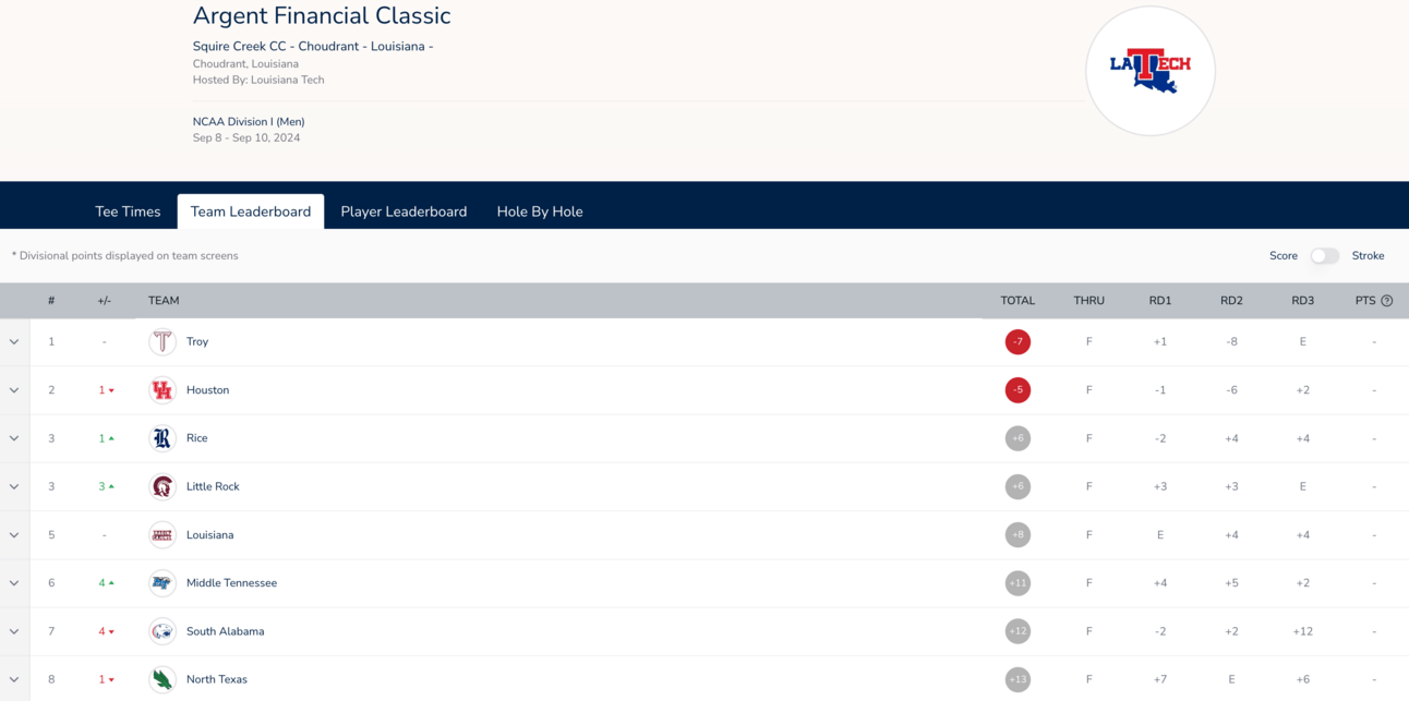 This week we just finished up our first event of the season at the Argent Financial Classic hosted by Louisiana Tech at Squire Creek Country Club. Overall it was a solid start to the year and to post the low team final round on a difficult golf course and finish T3rd. The golf course received five inches of rain before the practice round last Saturday, but the greens remained very firm forcing all shots to land on the green which put a premium on hitting the fairway and tested short games. For the entire event some the guys struggled with a few situational decisions and our short games were not sharp enough for us to win this week.