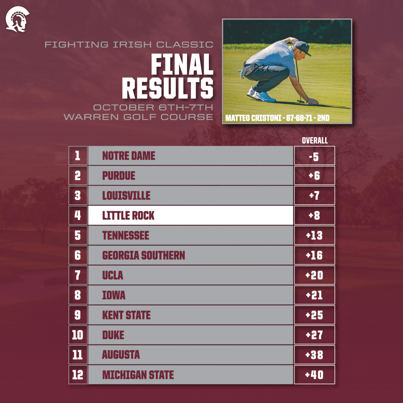 It was a complete team effort by the guys this week! I am super proud of Matteo for his runner-up finish in one of the strongest fields in college golf. Matteo played fantastic all week on a very challenging golf course and in tough weather conditions. As your read further below we were in a very similar position in Cincinnati and did not capitalize, so it was great to see us learn from that experience which I think helped us in the final round at Notre Dame.