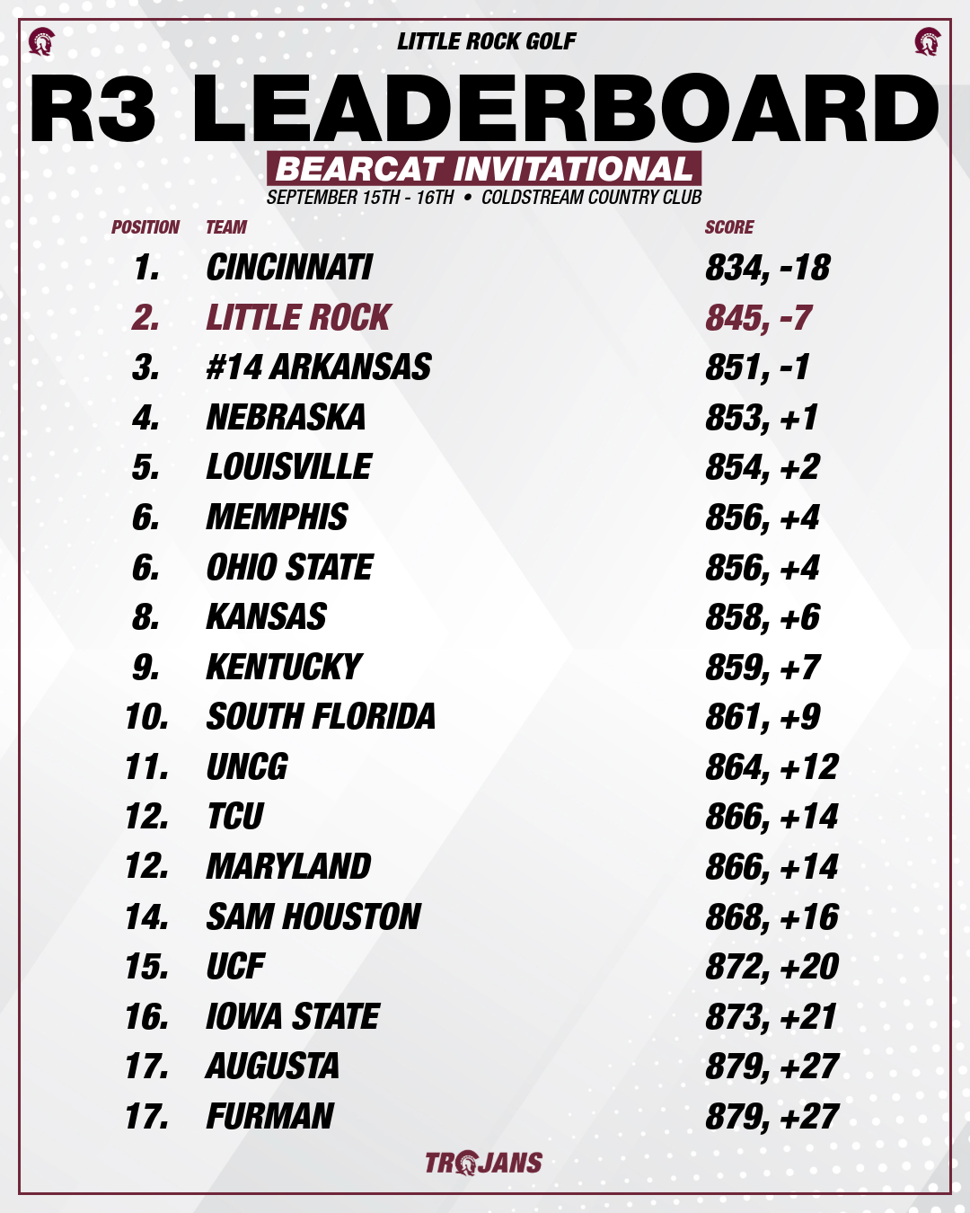 Straight from Minnesota we had a couple days to really work hard on our short game before heading to Cincinnati for the Bearcat Invitational. We got off to a shaky start on the 36 hole day and sat at +6 with 6 holes remaining, but the guys finished strong on the easy portion of the golf course to play the last 6 holes in 9-under par to move into 3rd and put ourselves in the final pairing once again at the Bearcat (were in the final pairing in 2024 as well). The flurry of birdies to finish round 2 gave us the low team round in round 2 along with host school Cincinnati who were in the lead after two rounds. The momentum from round 2 carried over into round 3 as we shot 4-under in the final round to finish in 2nd place and defeat the #14 ranked RAZORBACKS by 6 shots who finished in 3rd. Razorback transfer, Mark Stockdale, led the Trojans at 5-under par for the event to finish in 3rd place individually. Sophomore Ed Featherstone fired an incredible 4-under 67 in the final round to finished T6th at 4-under par. Ed’s final round was the lowest final round by anyone in the field. IT WAS A GREAT DAY TO BE A TROJAN!