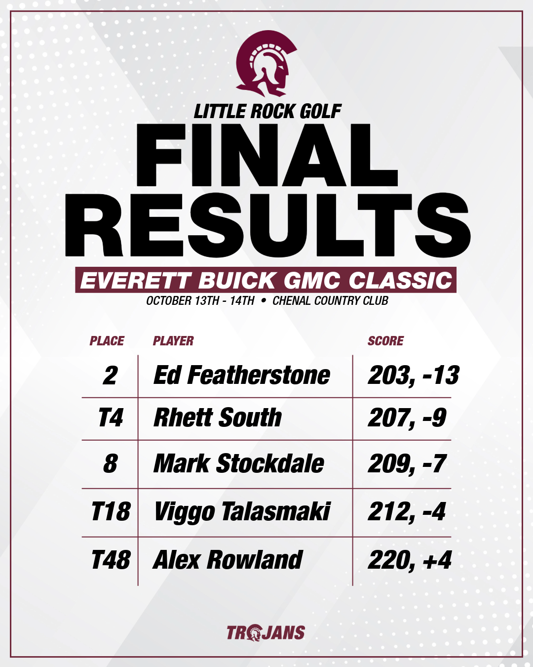 We capped off the fall season with a BIG win at Chenal Country Club on the Founders course by shooting 34-under par and winning the event by 21 shots! Ed featherstone once again led the team finishing in 2nd place to cap off a fantastic fall season for him.